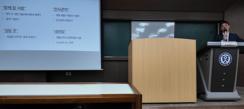 강연 중에는 '함께 개업할 사람과의 신뢰', '공동 운영 방식', '직원 채용 시기', '로펌 네이밍 전략' 등
